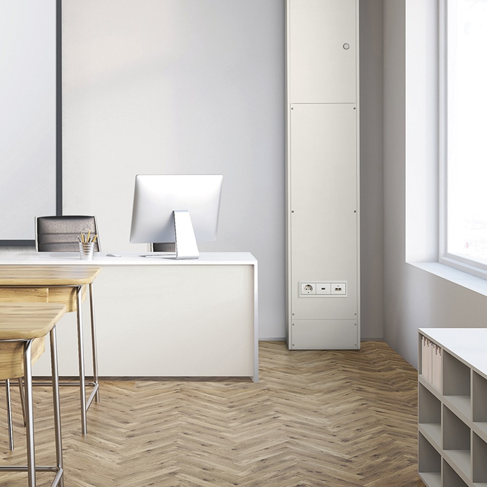 Energie-, Daten- und Multimediaanschlüsse im direkten Zugriff. Die Bodenanschlusssäule kann individuell bestückt direkt neben dem Lehrerpult platziert werden. So vermeiden Sie Stolperfallen zwischen Pult und Tafel und können auf zusätzliche Verlängerungskabel verzichten. Die Bodenanschlusssäulen eignen sich auch, um Schülerinnen und Schüler mit Strom- und Netzwerkanschlüssen mitten im Raum zu versorgen. Egal, wie die Tische z.B. für Gruppenarbeiten platziert werden.